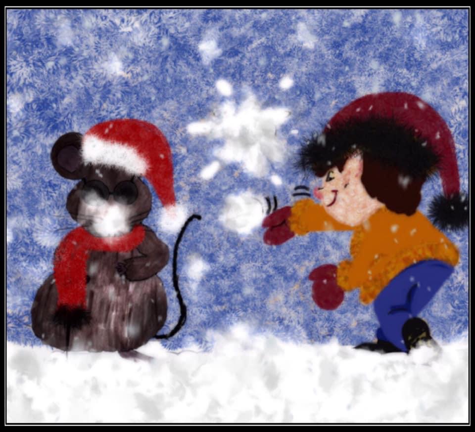 Dieser Schneeball trifft Baltazaar so unvermittelt, dass der Mäuserich nach hinten umkippt und komplett in den Schnee fällt.
