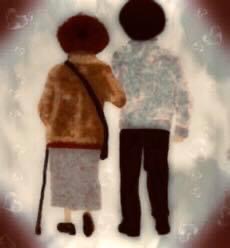 Ein schon älteres Pärchen geht Hand in Hand langsam, sich gegenseitig stützend und immer wieder liebevoll ansehend die Straße entlang.